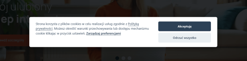 - Przycisk został dodany na belce banera, pomiędzy opcjami „Akceptuj wszystkie” i „Ustawienia”. Ułatwia użytkownikom natychmiastowe odrzucenie wszystkich plików cookies.