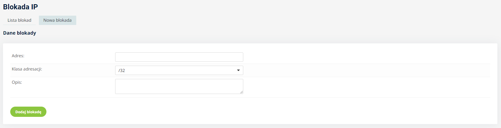 W menu panelu administracyjnego pojawił się nowy moduł Narzędzia/Blokada IP umożliwiający zablokowanie wskazanego adresu IP