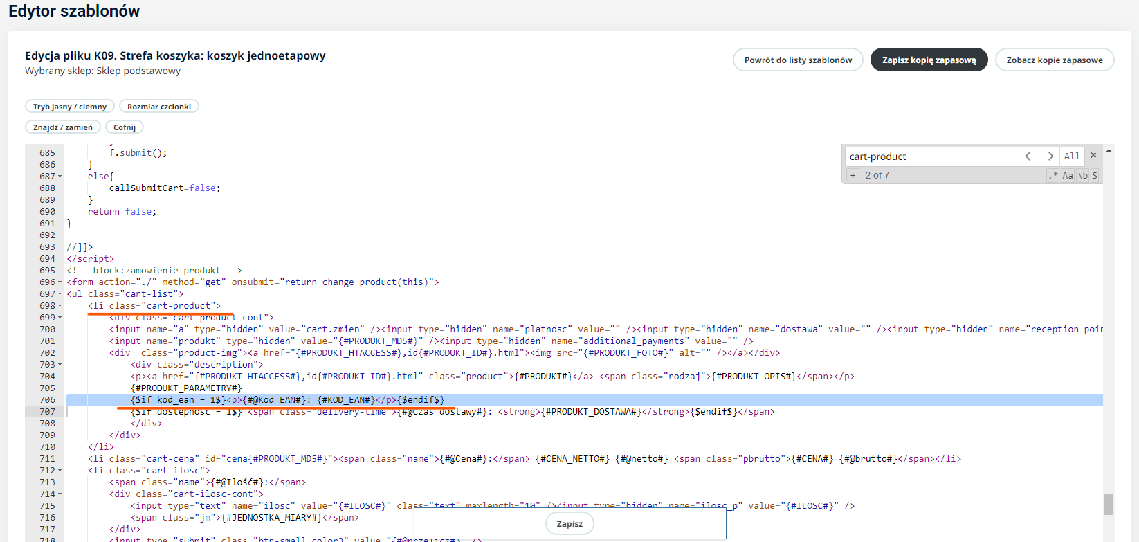 Aby kod EAN wyświetlany był pod nazwą produktu w koszyku, należy dodać poniższy kod w miejscu zaznaczonym na zrzucie ekranu. Aby przejść do edycji szablonu koszyka należy w menu panelu administracyjnego wybrać Wygląd/Edytor szablonów -> Elementy stron, a następnie w zależności od formy koszyka, którą używamy należy wprowadzić opisane wcześniej zmiany we właściwym szablonie koszyka. Dla koszyka jednoetapowego będzie to szablon K09. Strefa koszyka: koszyk jednoetapowy. Dla koszyka 4-etapowego będzie to szablon K01. Strefa koszyka: zawartość koszyka, wybór form płatności i dostawy