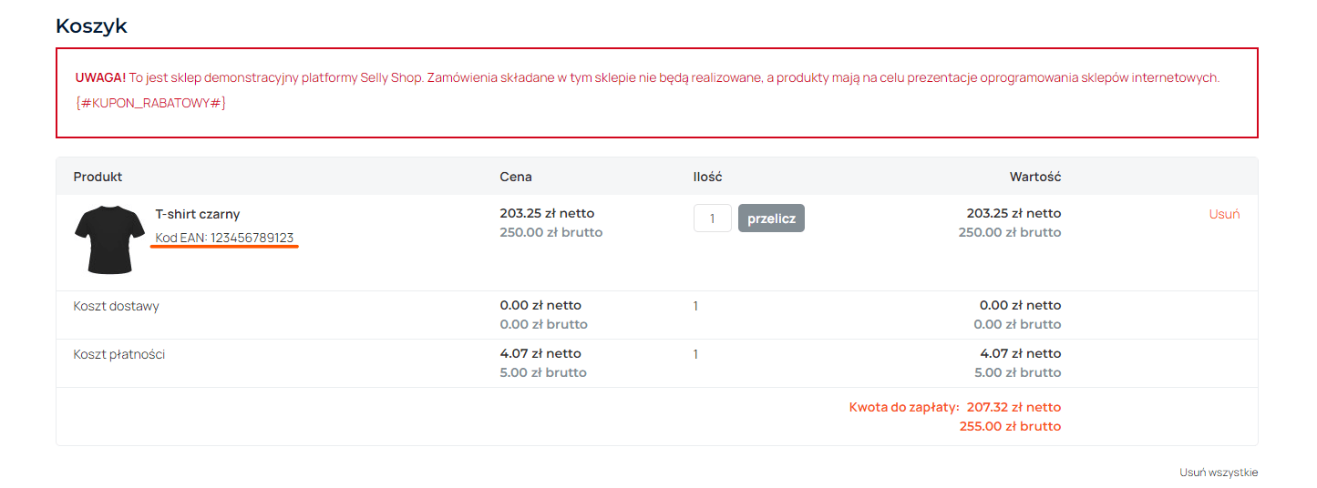 W szablonach koszyka można stosować zmienną szablonu kod_ean oraz znacznik {#KOD_EAN#} w blokach dotyczących produktów koszyka.