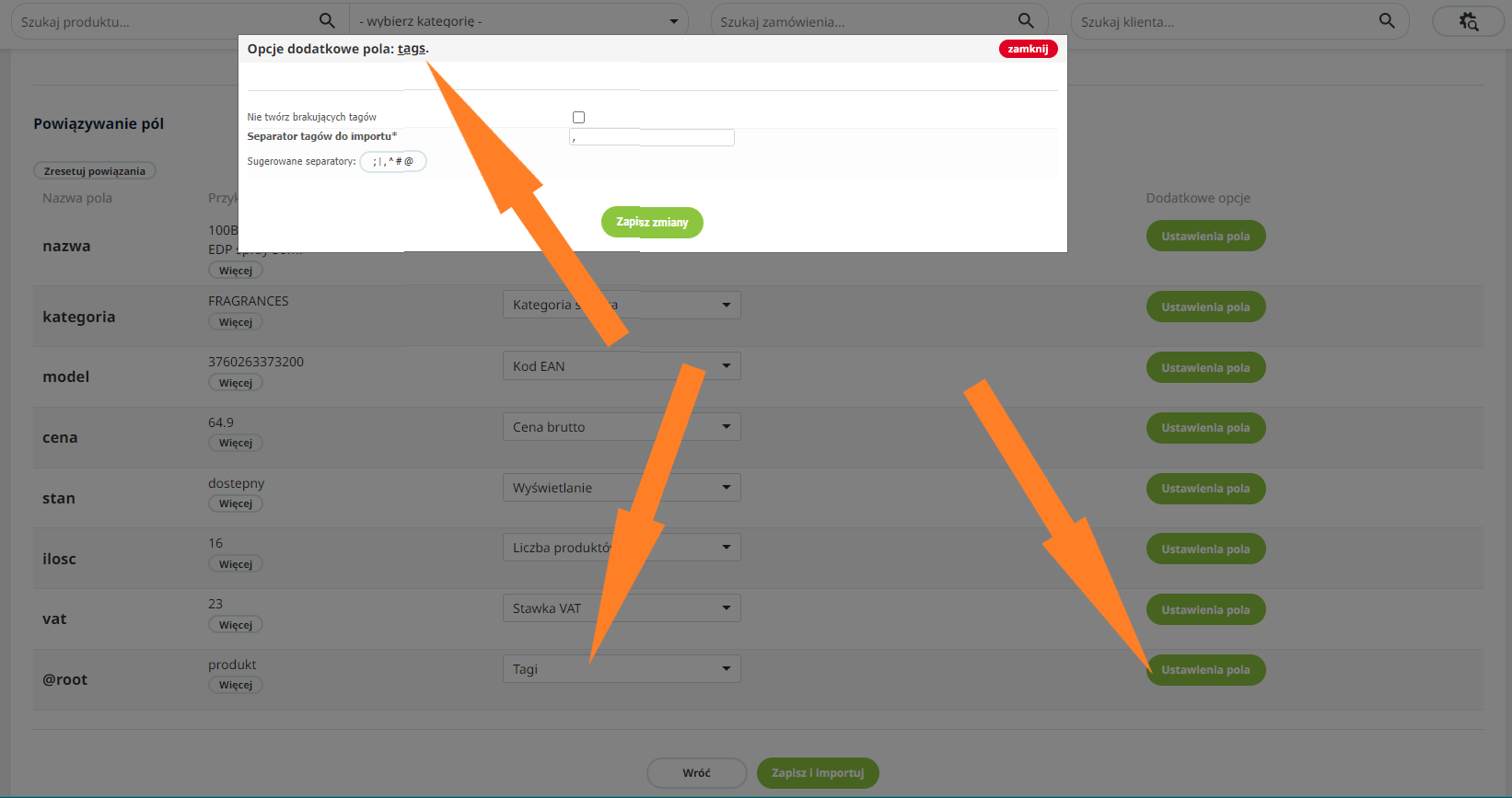 Integrator XML/CSV został rozbudowany o dodatkowe pole „TAGI”, które umożliwia przyporządkowanie produktów do danego tagu, a jeśli tagu nie ma w bazie danych, to możliwe jest dodanie go do listy tagów za pomocą importu. Tagi można podawać rozdzielone separatorem lub w nowych wierszach. Dodawanie tagów możliwe jest przy powiązaniu produktów po ID produktu lub po Kodzie EAN.