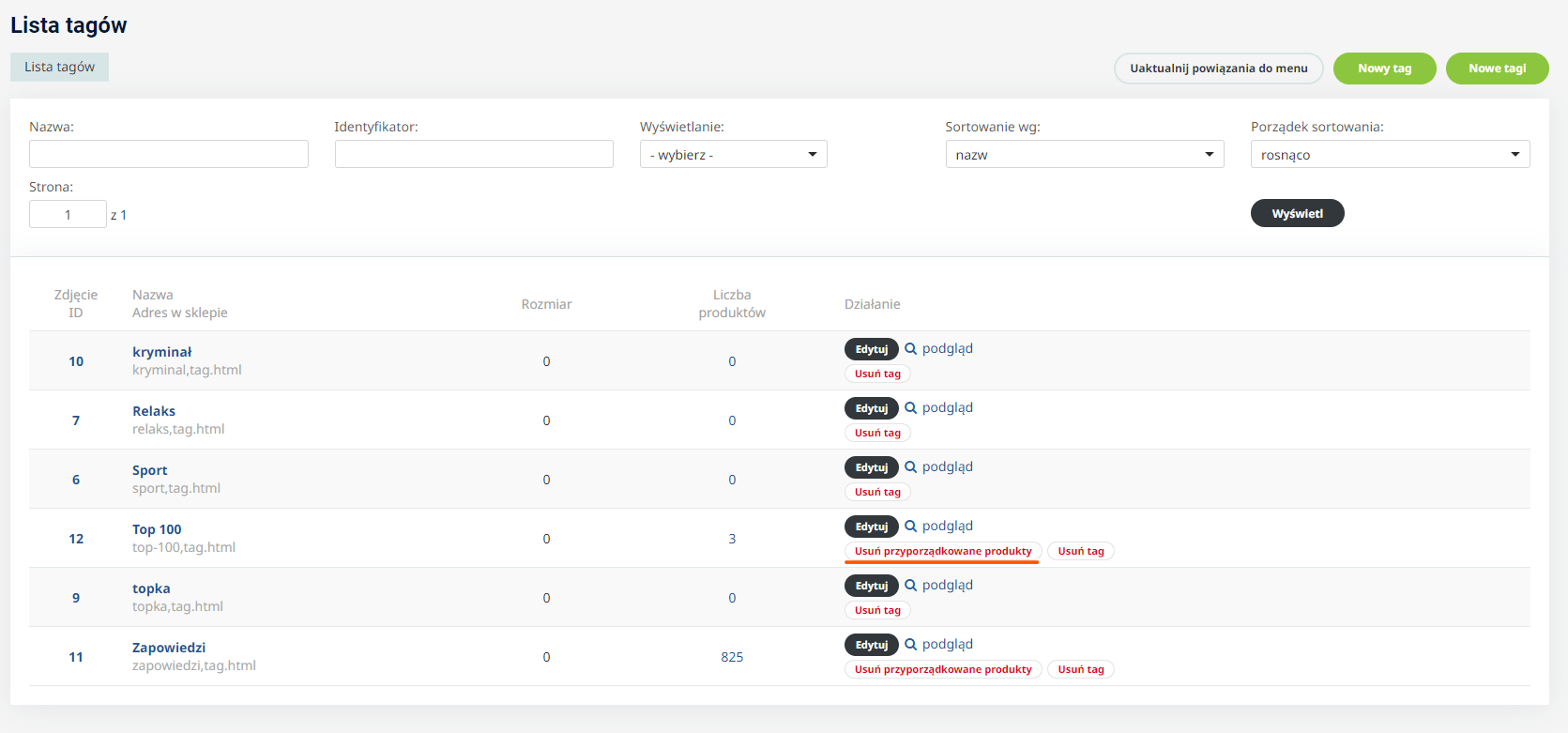 Masowe usuwanie przyporządkowania produktów do tagów