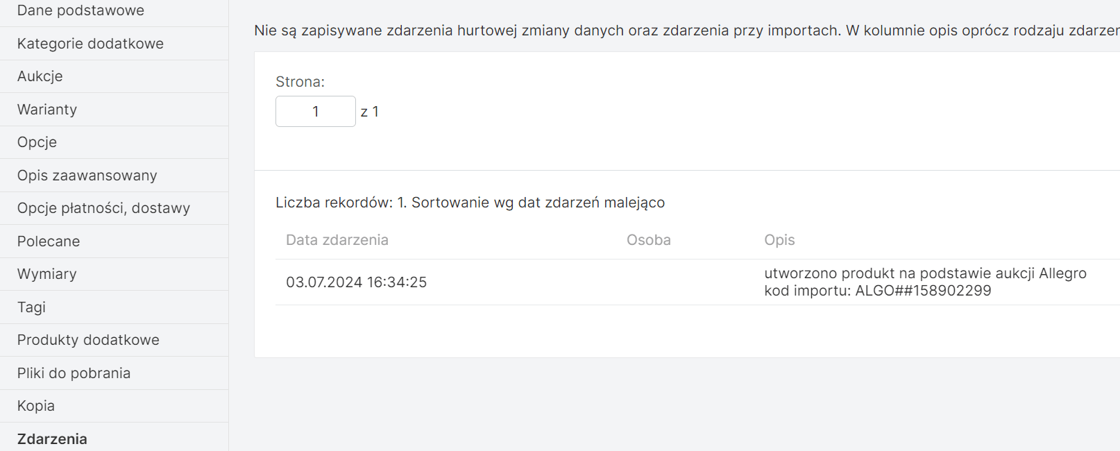 Dodaliśmy funkcję logowania w edycji produktu, która rejestruje i wyświetla informacje o imporcie produktów z Allegro. Każdy produkt zaimportowany z Allegro zostaje oznaczony w logach, co umożliwia szybkie sprawdzenie, czy produkt został stworzony na podstawie aukcji i za pomocą jakiego kodu importu. Ta funkcja zapewnia lepszą przejrzystość procesu importowania i pomaga w zarządzaniu produktami pochodzącymi z zewnętrznych źródeł.