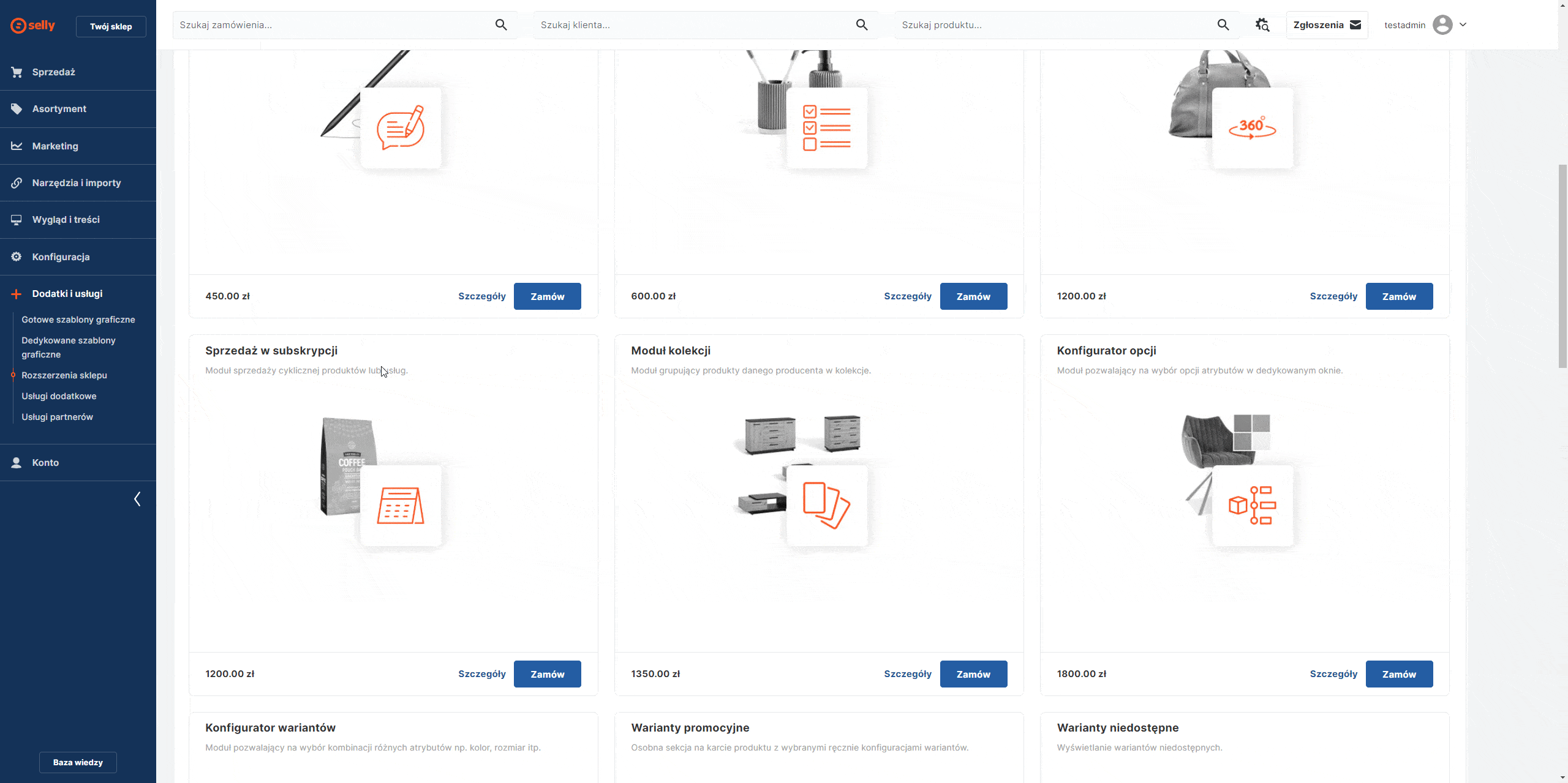 W ramach planu Selly 2 wprowadziliśmy nową funkcję, która umożliwia zamawianie rozszerzeń dla sklepu. Ta opcja pozwala użytkownikom na dostosowanie i rozbudowę funkcjonalności swojego sklepu internetowego poprzez dodanie specjalistycznych rozszerzeń. Rozszerzenia te można zamówić bezpośrednio z panelu użytkownika w sekcji Dodatki i usługi -> Rozszerzenia sklepu.