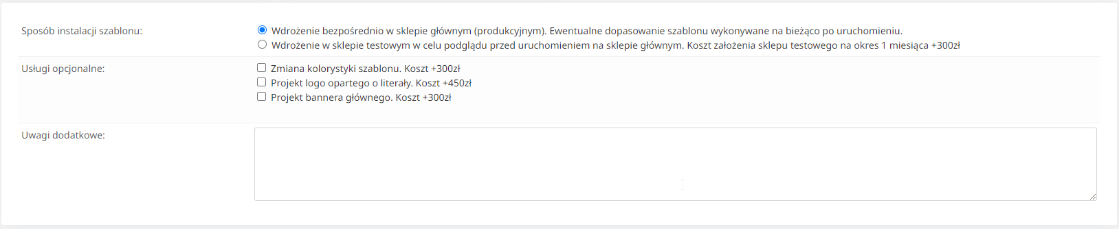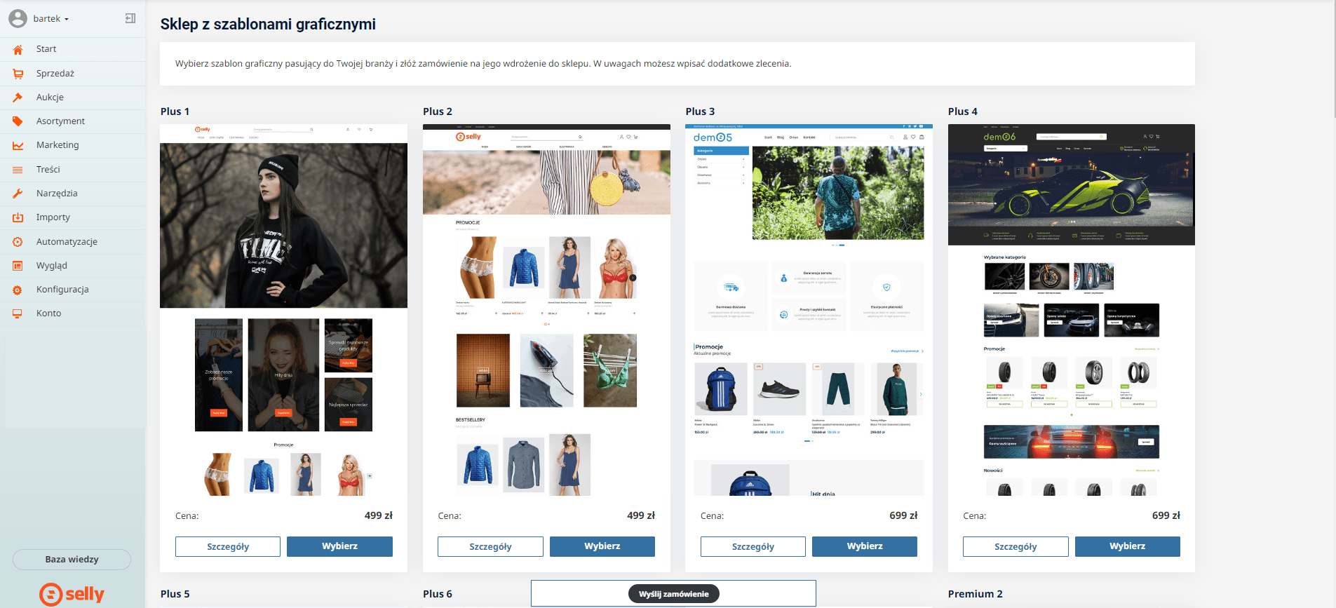 Został dodany nowy moduł Wygląd/Sklep z szablonami graficznymi umożliwiający zakup szablonu graficznego dla sklepu. Do wyboru jest 18 różnych szablonów, uniwersalnych oraz dostosowanych do konkretnych branż. Z poziomu modułu można dokonać zamówienia szablonu oraz wpisywać uwagi do wdrożenia w polu „Uwagi dodatkowe”.