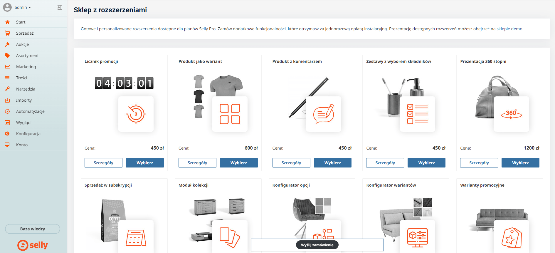 W panelu administracyjnym sklepów w planach Selly Pro, dodaliśmy nowy moduł Wygląd/Sklep z rozszerzeniami umożliwiający zamówienie gotowych rozszerzeń za pomocą kilku kliknięć. Dodatkowo każde rozszerzenie zostało szczegółowo opisane, a przykłady można zobaczyć na stronie https://demo-pro.selly.pl/