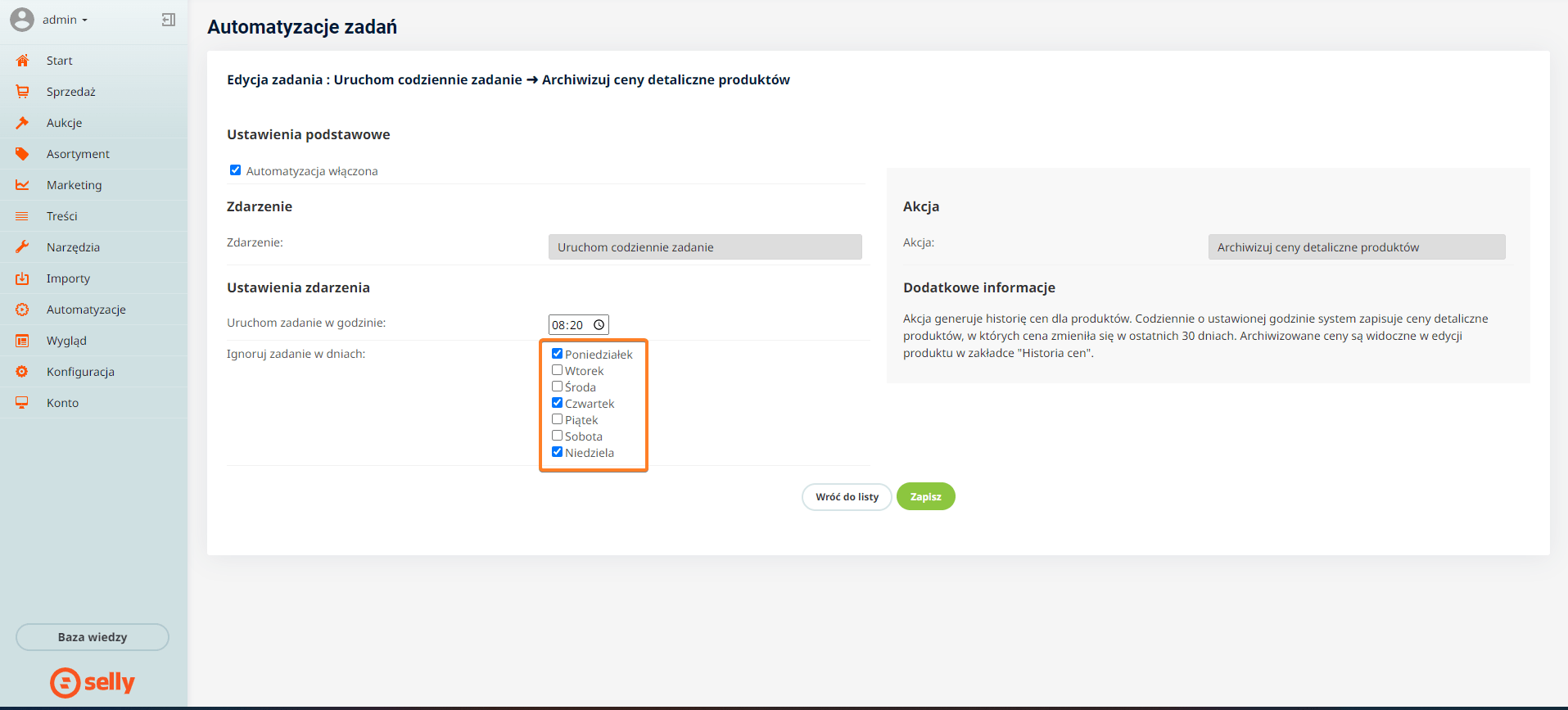 W module Automatyzacje/Automatyzacje zadań dodaliśmy możliwość wyboru dni wykonania konkretnego zadania cyklicznego. W praktyce wygląda to w ten sposób, że tworząc codzienne zadanie np. archiwizacji cen, możemy zaznaczyć, w których dniach zadanie ma być ignorowane, a co za tym idzie, archiwizacja cen ma zostać pominięta.