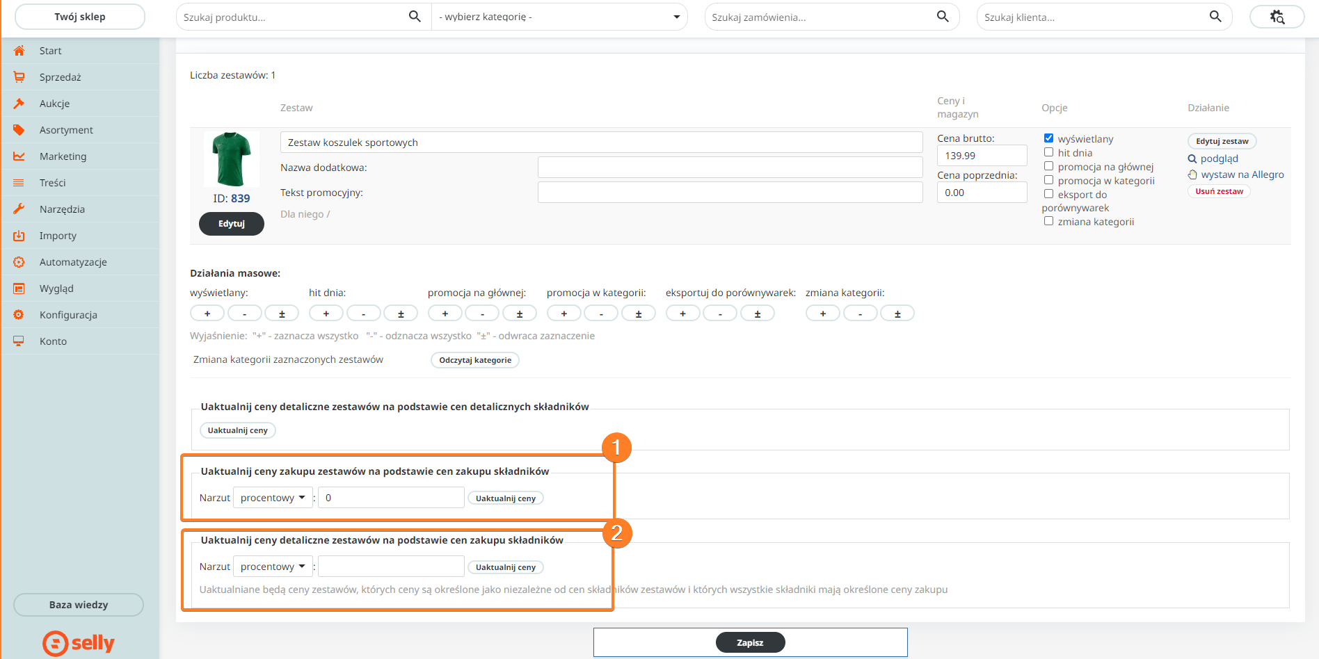 *Narzut na cenę zakupu, zadziała tylko w momencie, gdy wszystkie składniki zestawu będą miały wpisaną wartość w polu „Cena zakupu” w edycji produktu
