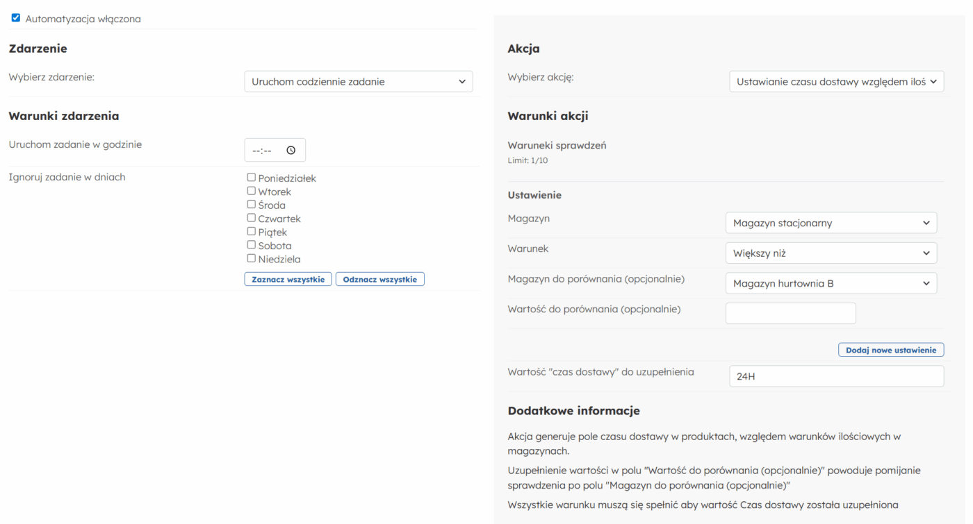 Wdrożono nową akcję w module automatyzacji zadań, która pozwala na automatyczne ustawianie czasu dostawy w produktach na podstawie bieżących stanów magazynowych.