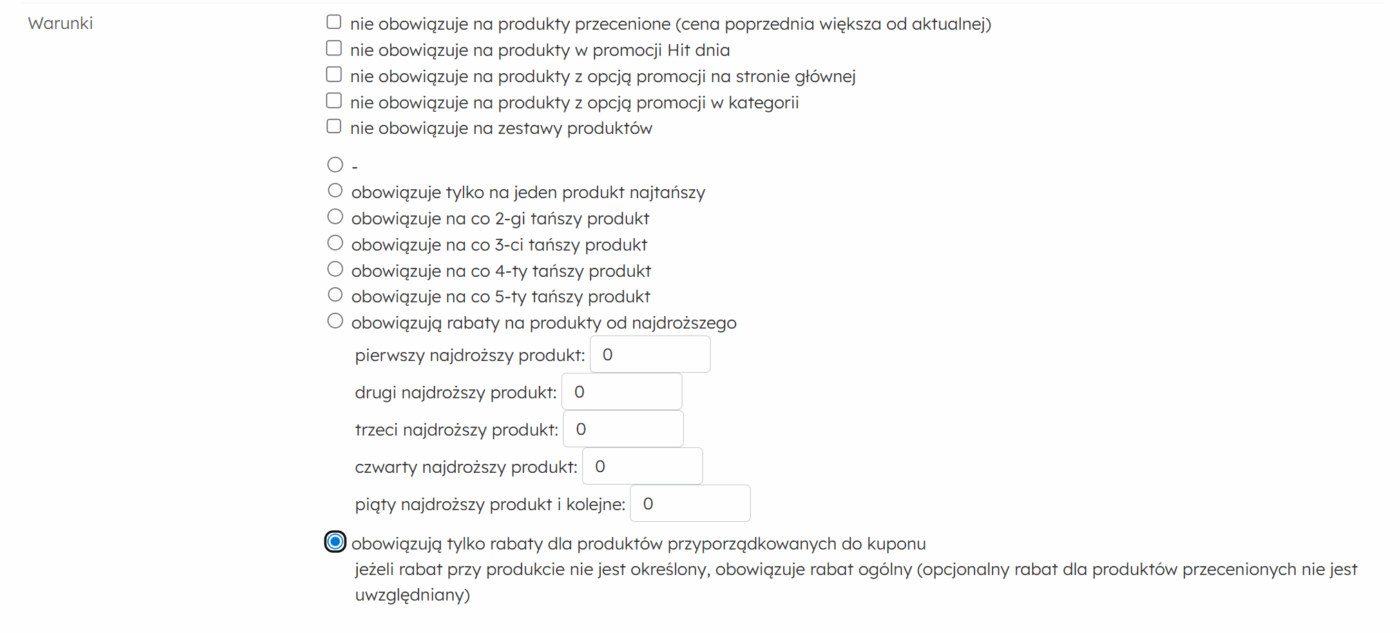 - Konfiguracja kuponu: Aby system uwzględnił te indywidualne ustawienia, w edycji kuponu rabatowego należy aktywować nowy warunek: „Obowiązują rabaty kwotowe zdefiniowane w edycji produktu”.