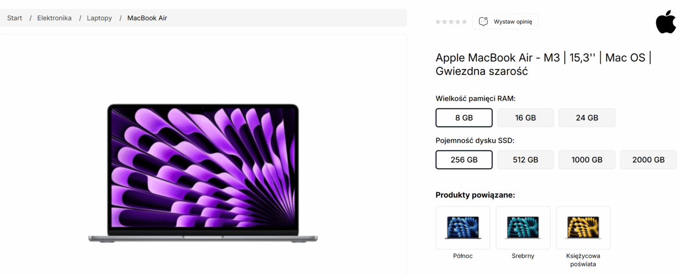 - Domyślnie funkcja ta jest ustawiona na „tak”. W takiej konfiguracji, jeśli klient przegląda np. kartę Apple MacBook Air Gwiezdna szarość, ten sam produkt pojawi się również na liście w sekcji produktów powiązanych.