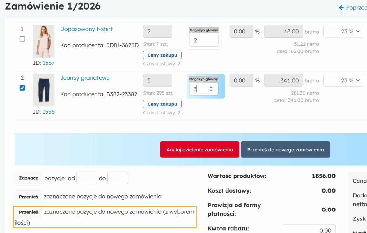 Przenoszenie produktów do nowego zamówienia z wyborem ilości