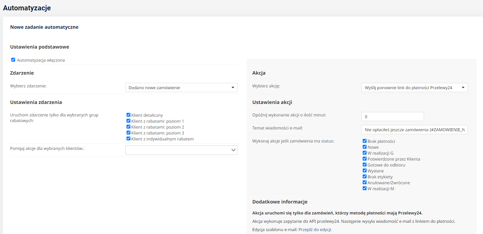 Nowy moduł Automatyzacje dostępny w planach Selly Pro 1 oraz Selly Pro 2 daje możliwość zautomatyzowania wielu procesów. Początkowo dostępne automatyzacje to m.in.: Automatyczna zmiana statusu zamówienia, automatyczne wysłanie wiadomości SMS, automatyczne wysłanie linku do ponowienia płatności w przypadku nieudanych transakcji czy automatyczne wysłanie faktury do danego zamówienia.