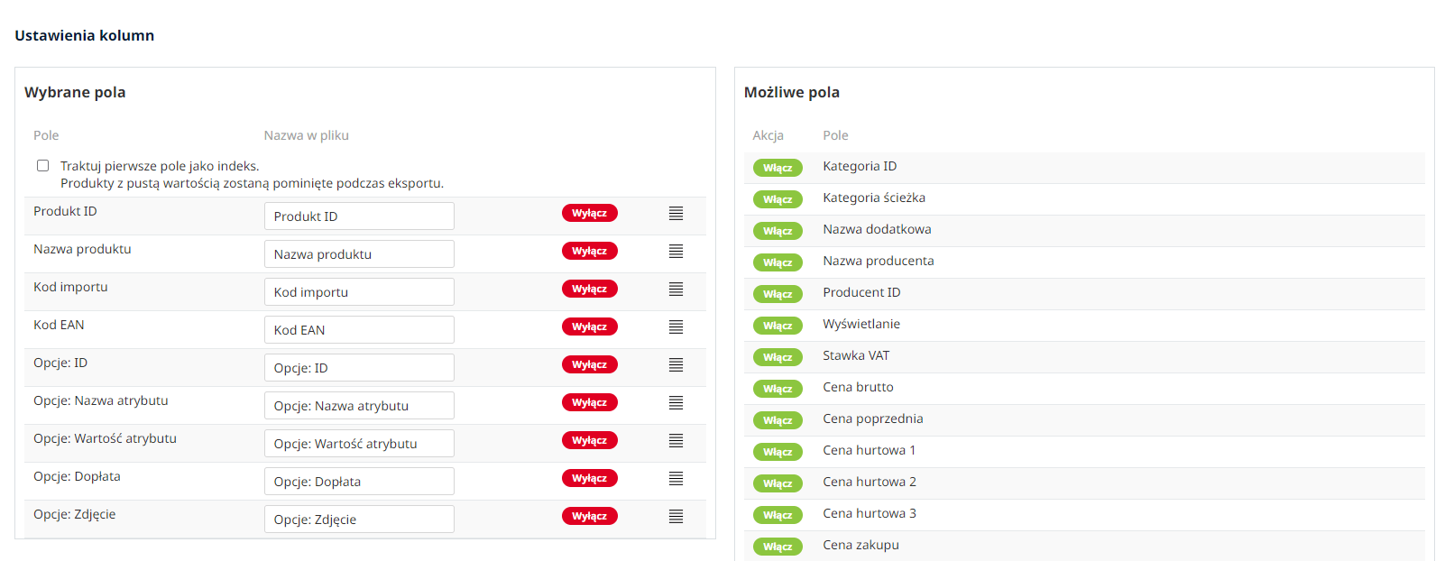 Opcje: Wartość atrybutu – Pole odpowiedzialne za eksport/import nazwy danego atrybutu/opcji produktu.