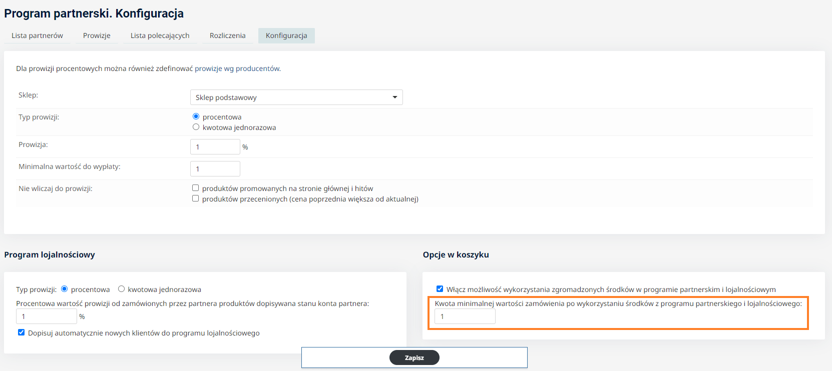 W konfiguracji programu partnerskiego oraz programu lojalnościowego została dodania możliwość wpisania kwoty minimalnej wartości zamówienia po wykorzystaniu środków z programu partnerskiego i lojalnościowego. Pozwoli to na zniwelowanie błędów powstałych po przesłaniu zamówienia o wartości 0zł do programu fakturowo-księgowego.