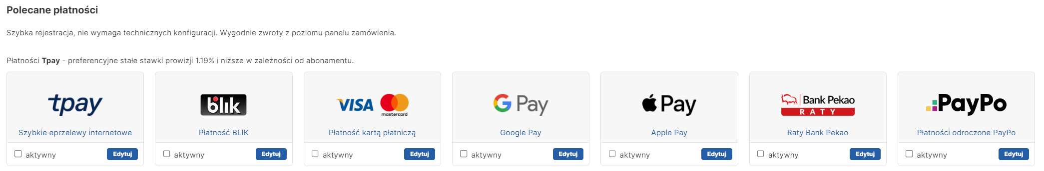 Wprowadziliśmy nową integrację z Tpay poprzez OpenAPI. Nowa integracja pozwala między innymi na włączenie: BLIK, karty, Google Pay, Apple Pay, Raty Bank Pekao, PayPo jako osobnych form płatności w koszyku.