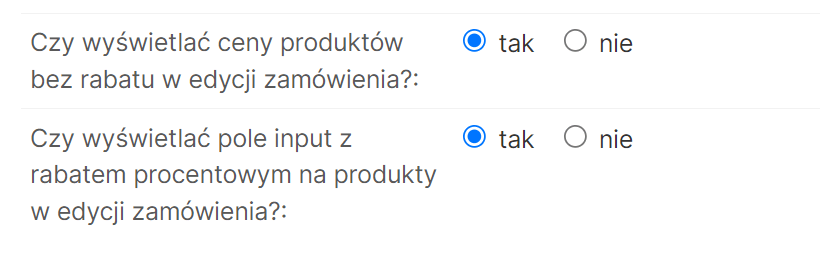 • Znajdź opcję „Czy wyświetlać pole input z rabatem procentowym na produkty w edycji zamówienia?”. Zaznacz „tak”
