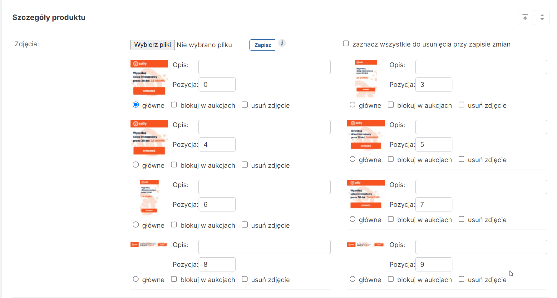 • Zaznacz wszystkie do usunięcia przy zapisie zmian: Pozwala na jednoczesne zaznaczenie wszystkich zdjęć produktu do usunięcia.