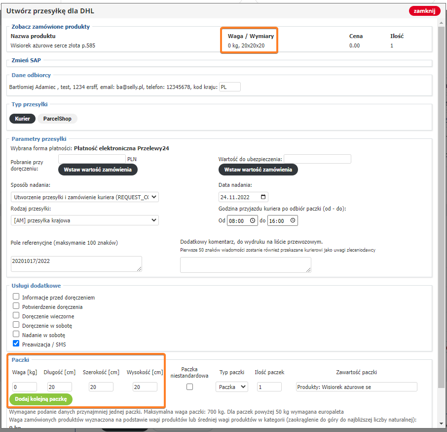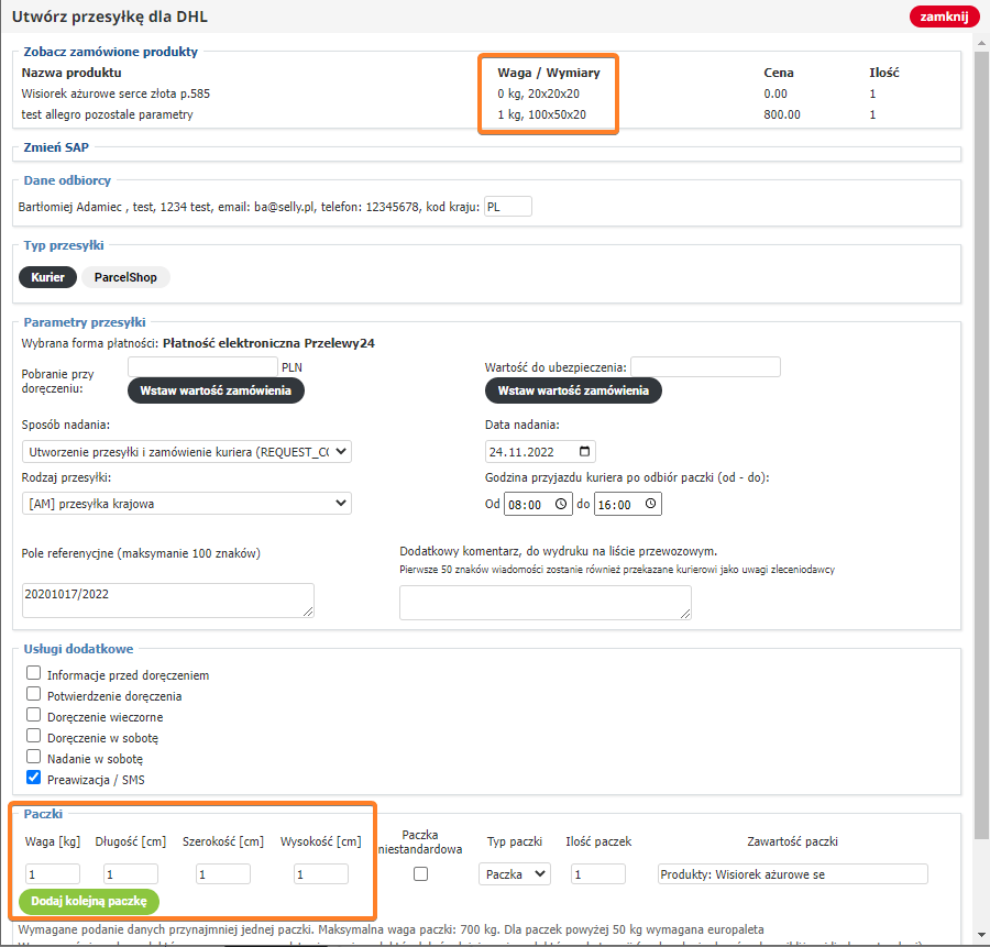 • Jeśli w zamówieniu jest więcej niż 1 produkt z wpisanymi wymiarami to wymiary zostaną jedynie wyświetlone informacyjnie podczas tworzenia listu przewozowego Inpost i DHL