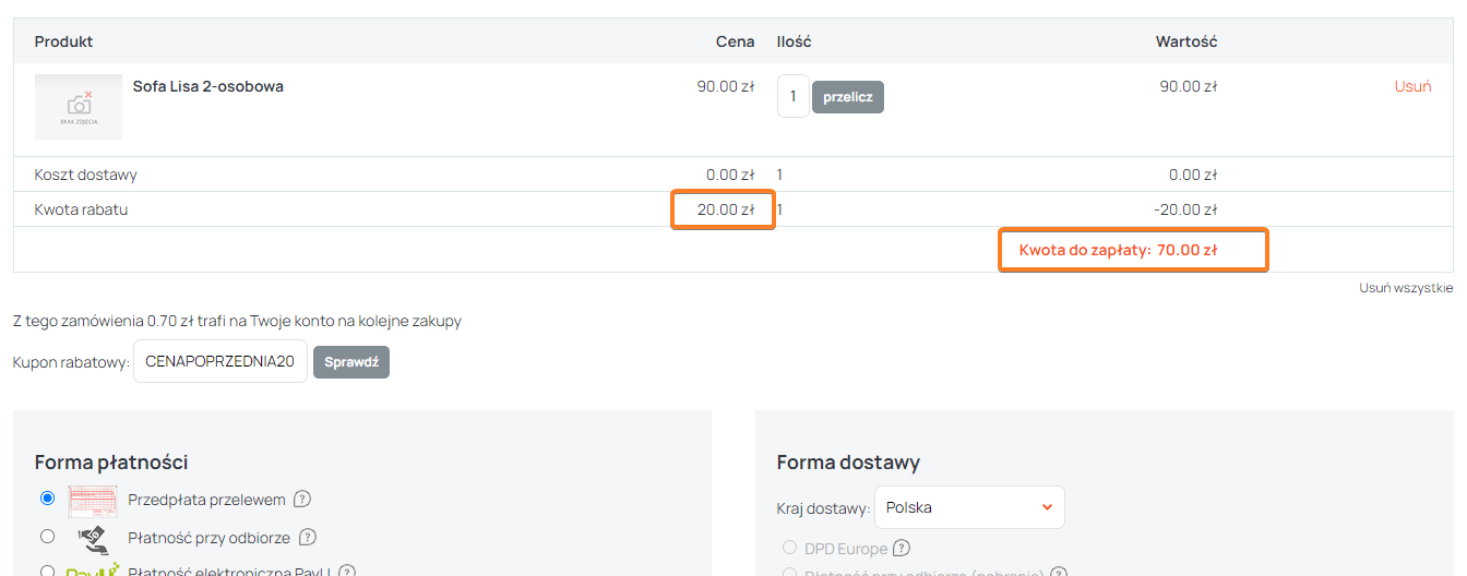 Utworzony został kupon, który obniża cenę o 20% wartości ceny poprzedniej.