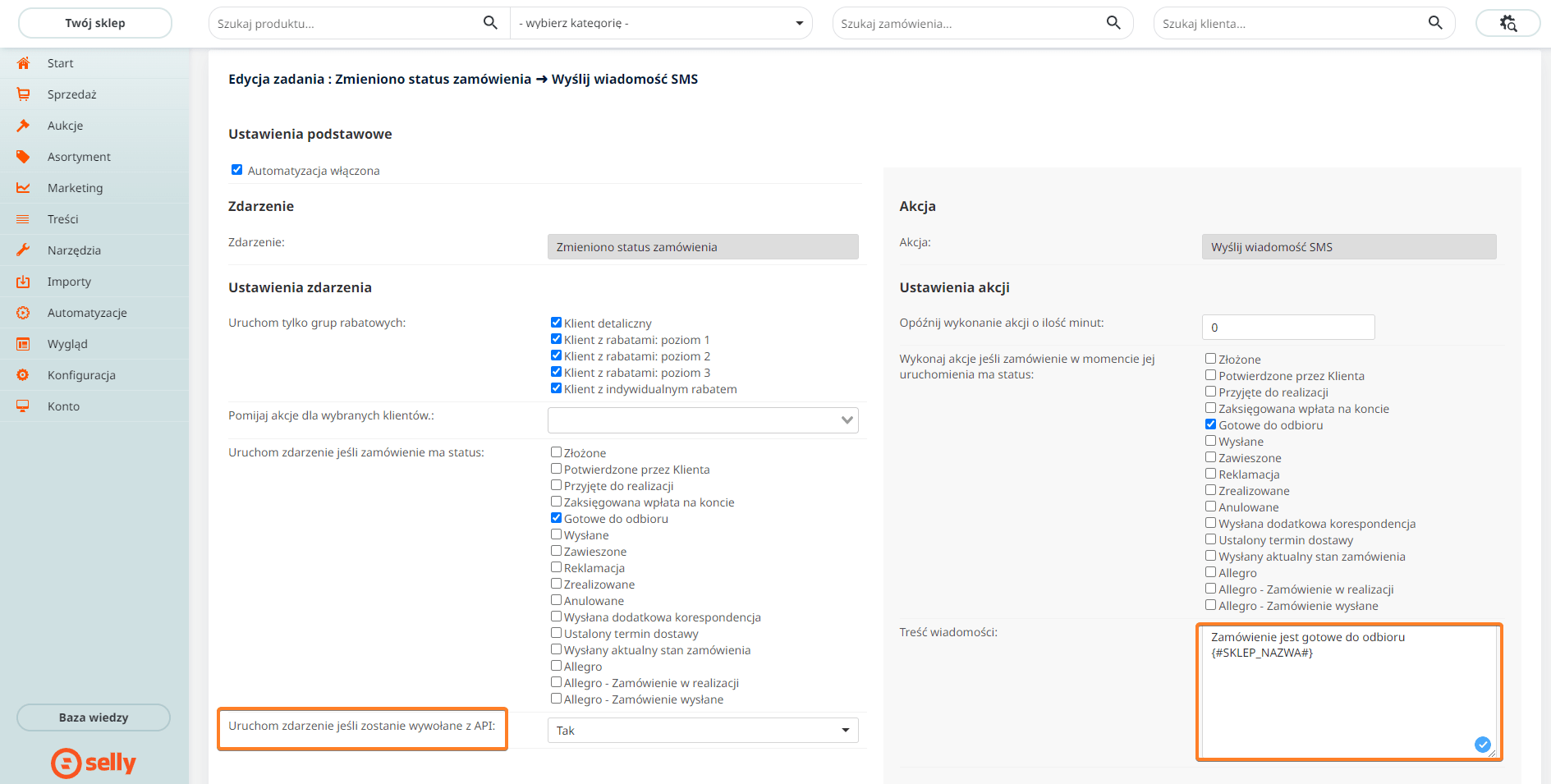 Jeżeli statusy zamówień zmieniane są przez zewnętrzny system po API, to można to wykorzystać np. do automatycznego wysłania SMS’a, którego treść można wpisać w polu „Treść wiadomości” w ustawieniach automatyzacji.