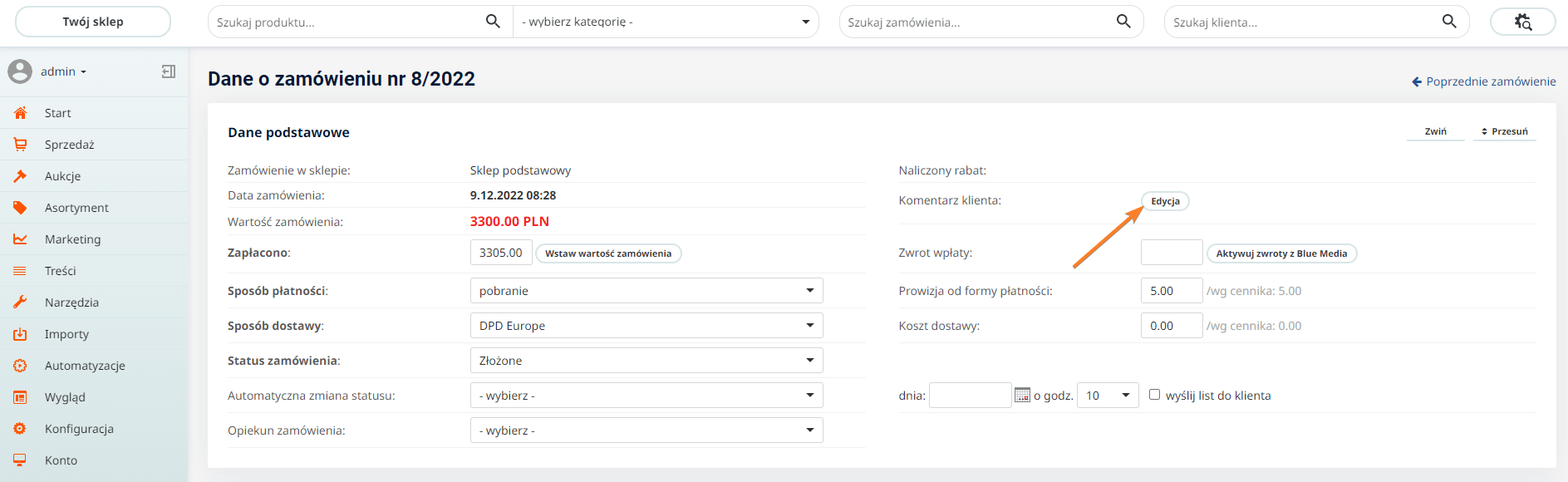 Możliwość edycji pola „Komentarz klienta” w zamówieniu