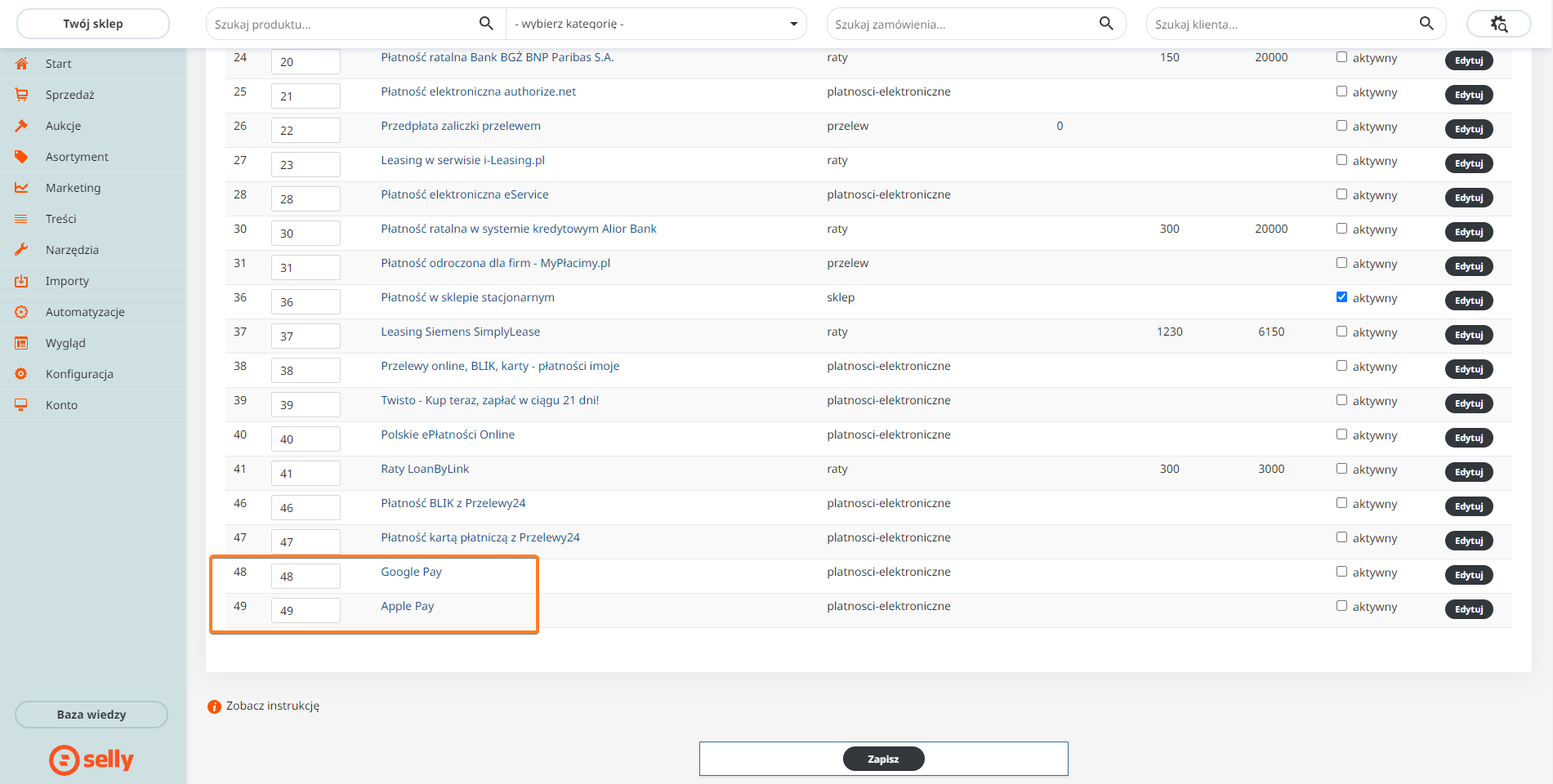 Zostały dodane nowe formy płatności w module Konfiguracja/Formy płatności.  Google Pay oraz Apple Pay obsługiwane są za pośrednictwem Autopay. Aby włączyć nowe formy płatności wymagana jest rejestracja w Autopay.