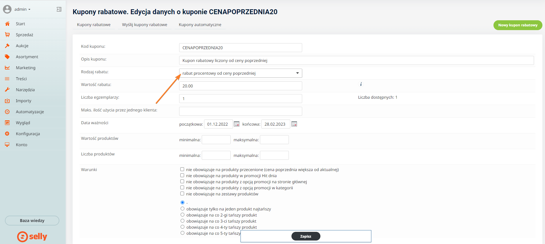 W module Marketing/Kupony rabatowe została dodana możliwość utworzenia kuponu rabatowego, który będzie liczył rabat na podstawie ceny poprzedniej (przekreślonej) produktu.