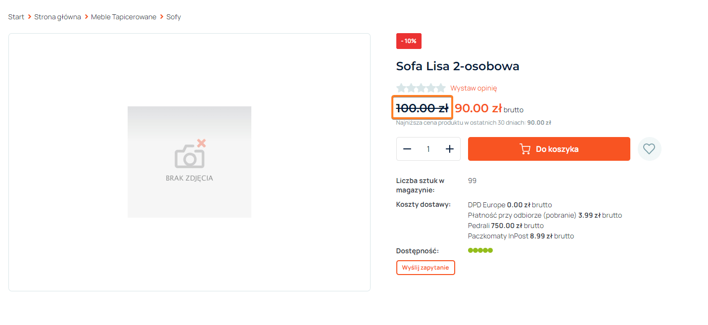 Produkt został przeceniony ze 100zł na 90zł, po zastosowaniu wcześniej utworzonego kuponu rabatowego, który obniża cenę produktu na podstawie ceny poprzedniej kwota rabatu wyniosła 20zł.