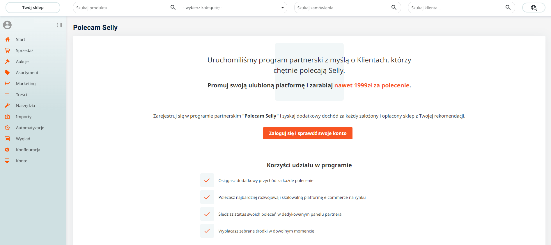 W panelu administracyjnym w menu została dodana nowa zakładka Konto/Polecaj Selly i zarabiaj umożliwia ona zapisanie się do programu partnerskiego Selly.