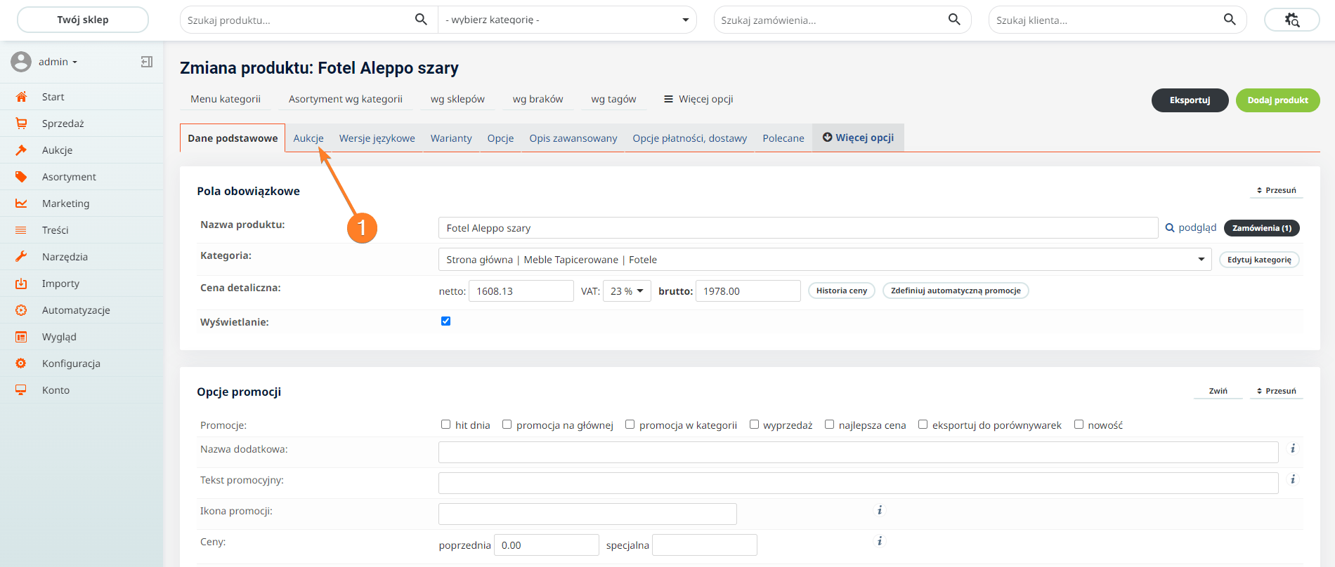 Aby wystawić ofertę, która nie znajduje się w katalogu produktów Allegro, należy przejść do edycji wybranego produktu i wybrać zakładkę Aukcje.