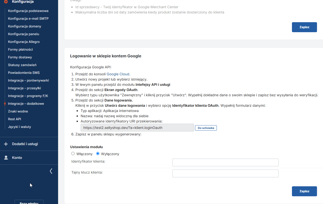 • W panelu administracyjnym sklepu znajdź sekcję Konfiguracja > Integracje dodatkowe > Google.