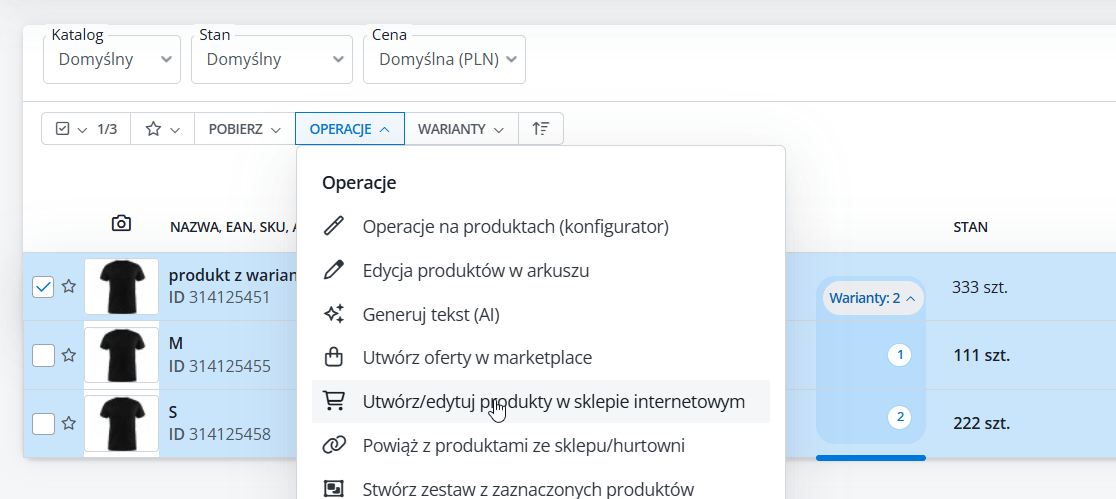 Dodaliśmy możliwość eksportu wariantów produktów z BaseLinkera do sklepu internetowego. Aby funkcja działała poprawnie, w BaseLinkerze muszą istnieć warianty oraz przypisane do nich parametry. Dzięki temu produkty wraz z wariantami zostaną przeniesione do sklepu w pełnej formie.