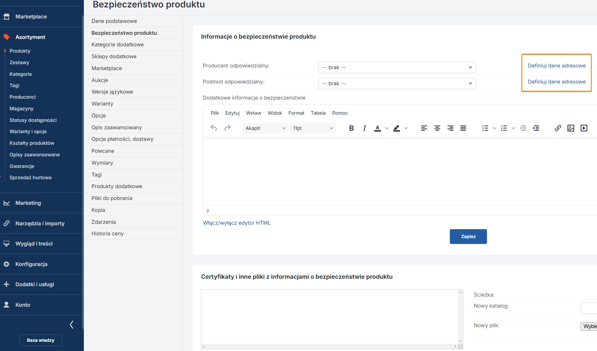 W ramach dostosowania do rozporządzenia GPSR, wprowadziliśmy nową zakładkę „Bezpieczeństwo produktu” w edycji produktu. Zakładka ta pozwala na zarządzanie danymi związanymi z bezpieczeństwem produktu oraz dodawanie odpowiednich certyfikatów.