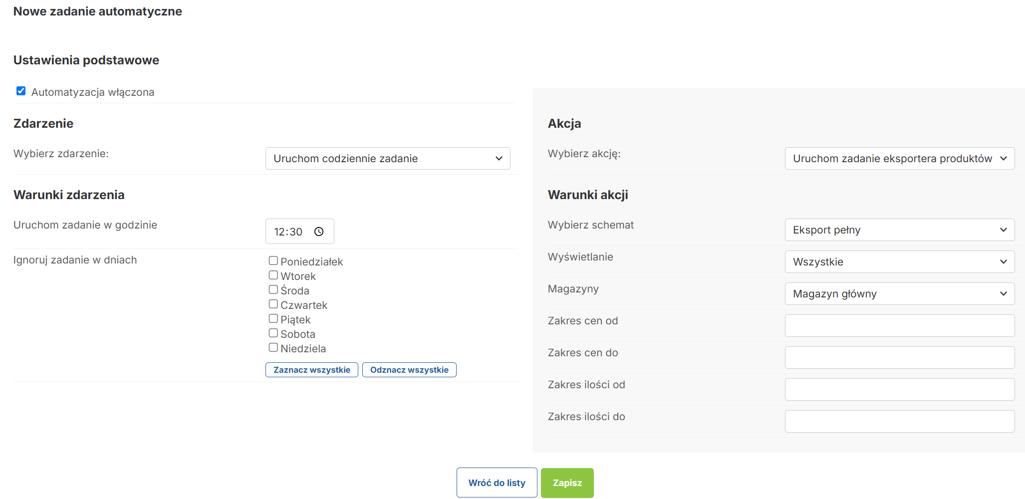• Wybierania schematów eksportu, magazynów, zakresów cen oraz ilości produktów.