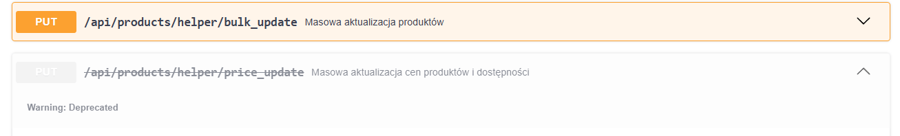 Nowa metoda /api/products/helper/bulk_update została wprowadzona do masowej aktualizacji produktów. Poprzednia metoda /api/products/helper/price_update została oznaczona jako Deprecated i nie będzie rozwijana.