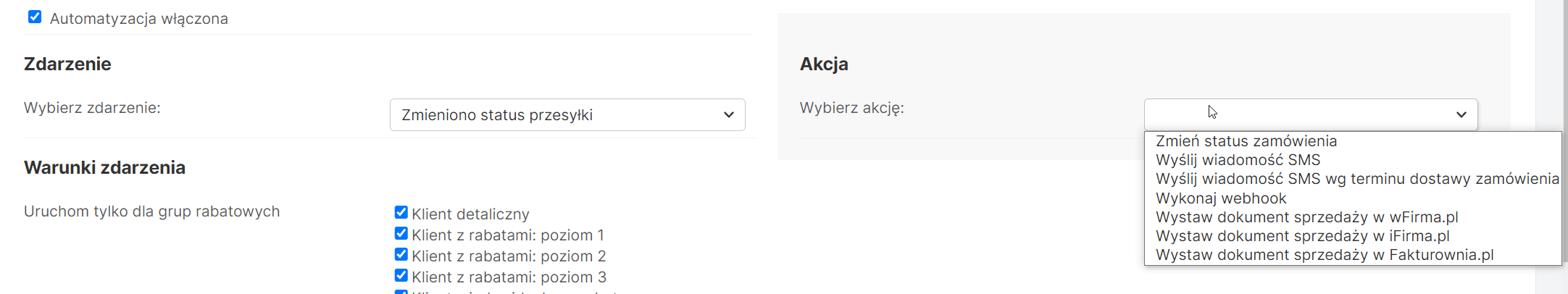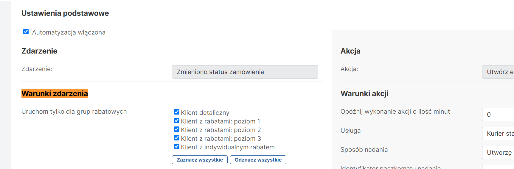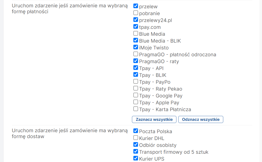 - Uruchom zdarzenie jeśli zamówienie ma wybraną formę dostaw