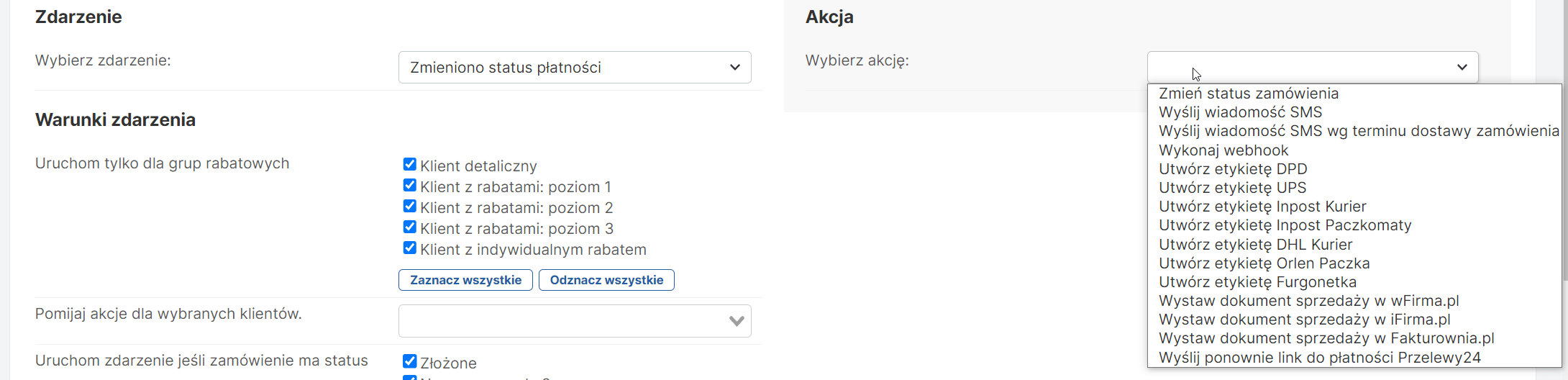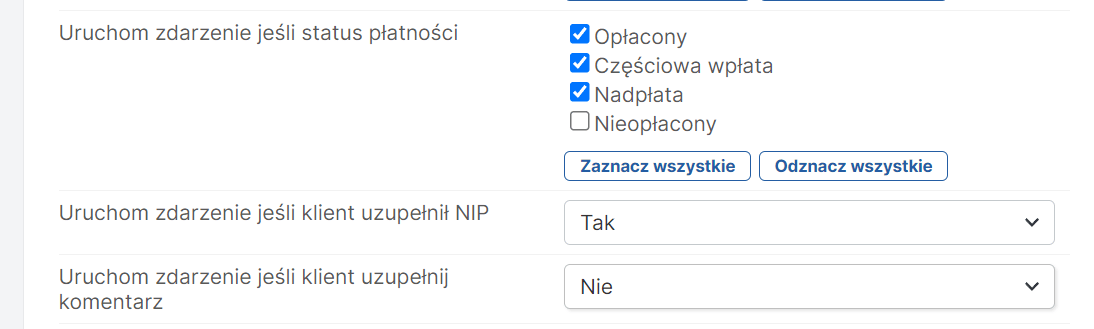 - Uruchom zdarzenie jeśli zamówienie ma wybraną formę płatności