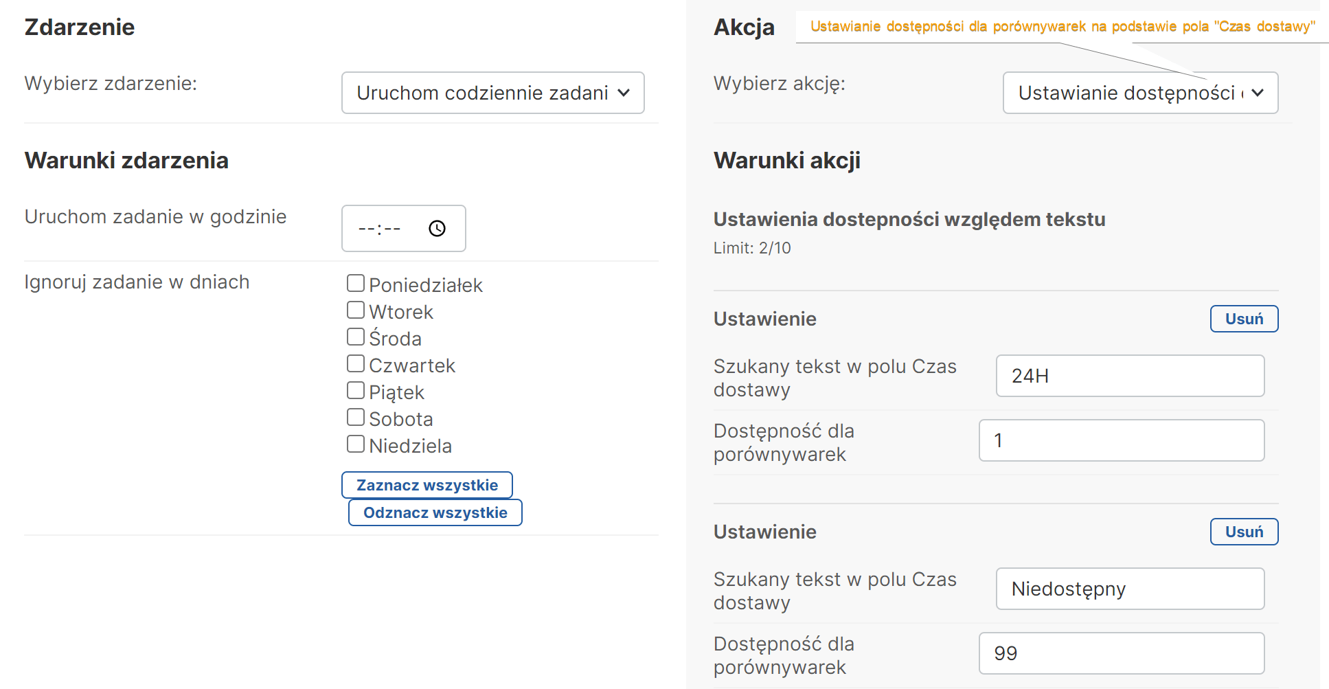 Nowa akcja: Ustawianie dostępności dla porównywarek na podstawie pola „Czas dostawy” dostępna jest dla wybrania codziennego zadania. Akcja aktualizuje dostępność dla porównywarek na podstawie pola „Czas dostawy”. Istnieje możliwość stworzenia 10 mapowań