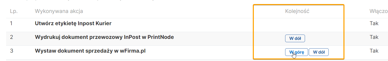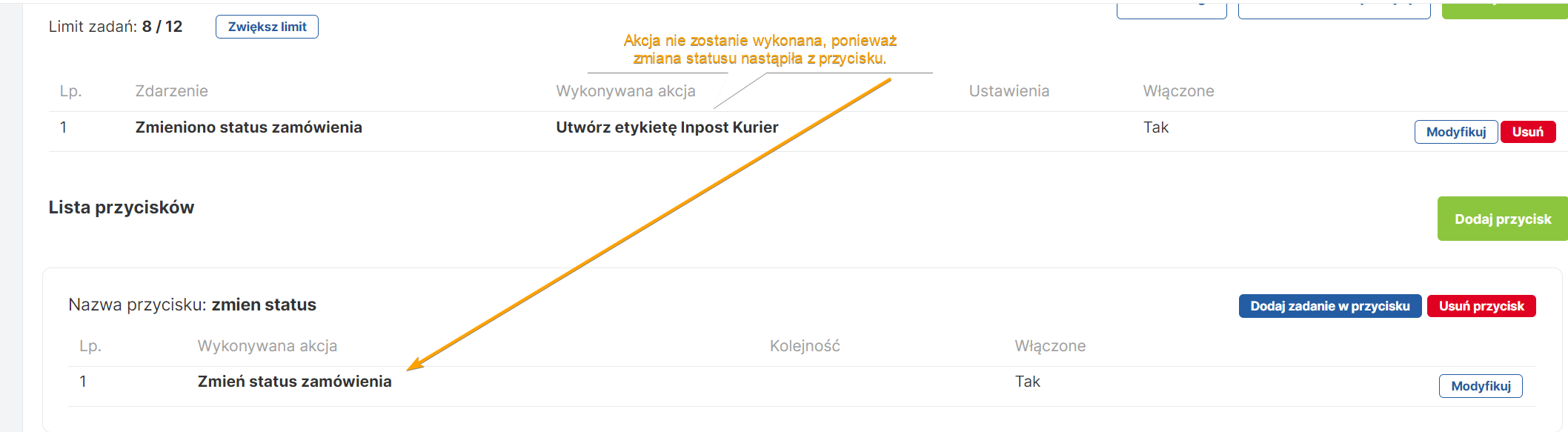 Przykład: w zadaniu z przycisku ustawiona jest akcja „Zmień status zamówienia”, jeśli posiadamy w zadaniu automatycznym również zadanie automatyczne zdarzenie: Zmieniono status zamówienia -> akcja: Utwórz etykiete Inpost Kurier , to zadanie automatyczne nie zostanie uruchomione.