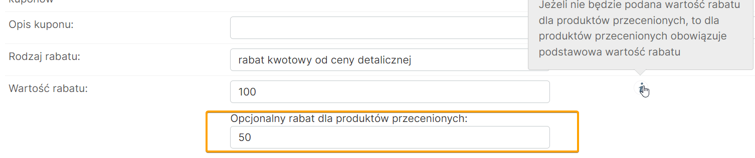 W kuponach rabatowych dodaliśmy nowe pole o nazwie „Opcjonalny rabat dla produktów przecenionych”. Wypełnienie tego pola daje możliwość ustawienie rozróżnienia kwoty rabatu dla produktów przecenionych.