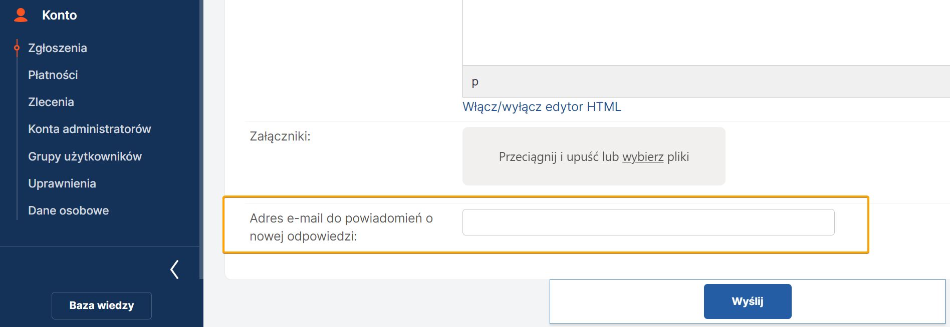 Podczas tworzenia nowego zgłoszenia w zakładce Konto / Zgłoszenia, udostępniliśmy możliwość wpisania adresu e-mail, na który będzie wysyłane powiadomienie o każdej udzielonej przez nas odpowiedzi.
