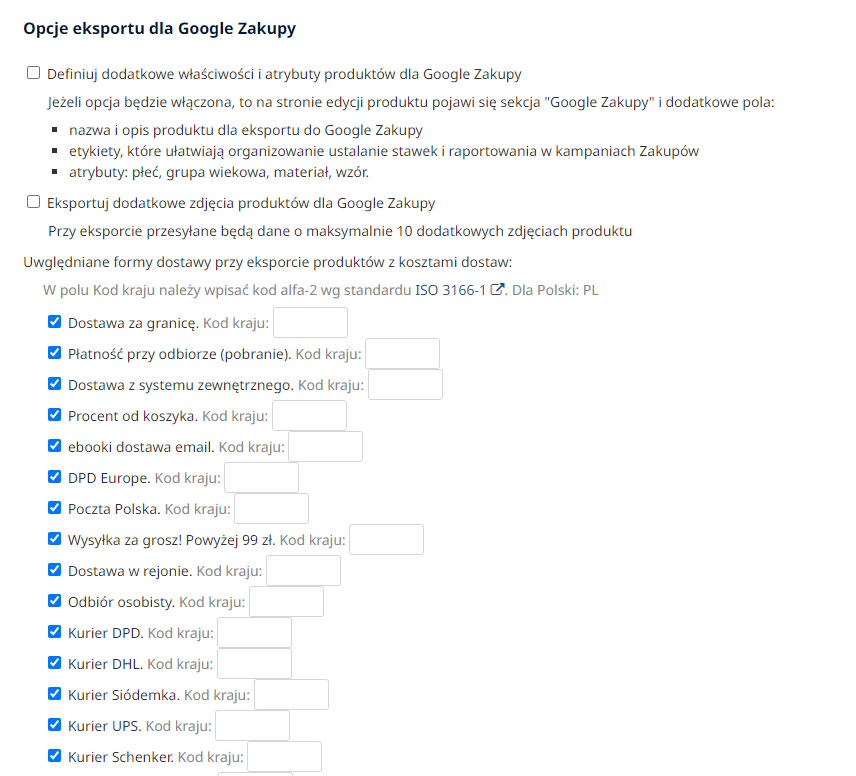 W module Konfiguracja/Integracje – porównywarki w zakładce Opcje eksportów dodaliśmy możliwość wpisania kodu kraju, który następnie zostanie wyeksportowany do pliku XML dla Google.