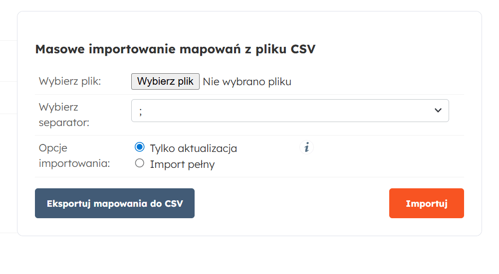 - Import pełny – czyści dotychczasowe mapowania i wgrywa całość od nowa.