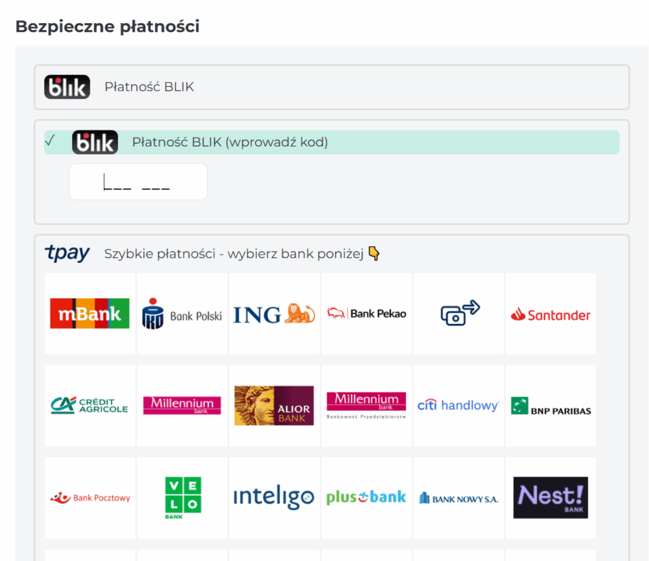 Dodaliśmy nowy wariant płatności BLIK, umożliwiający klientom wpisanie 6-cyfrowego kodu bezpośrednio w koszyku. To szybka i intuicyjna metoda płatności, która skraca proces zakupowy i zwiększa liczbę finalizowanych transakcji.
