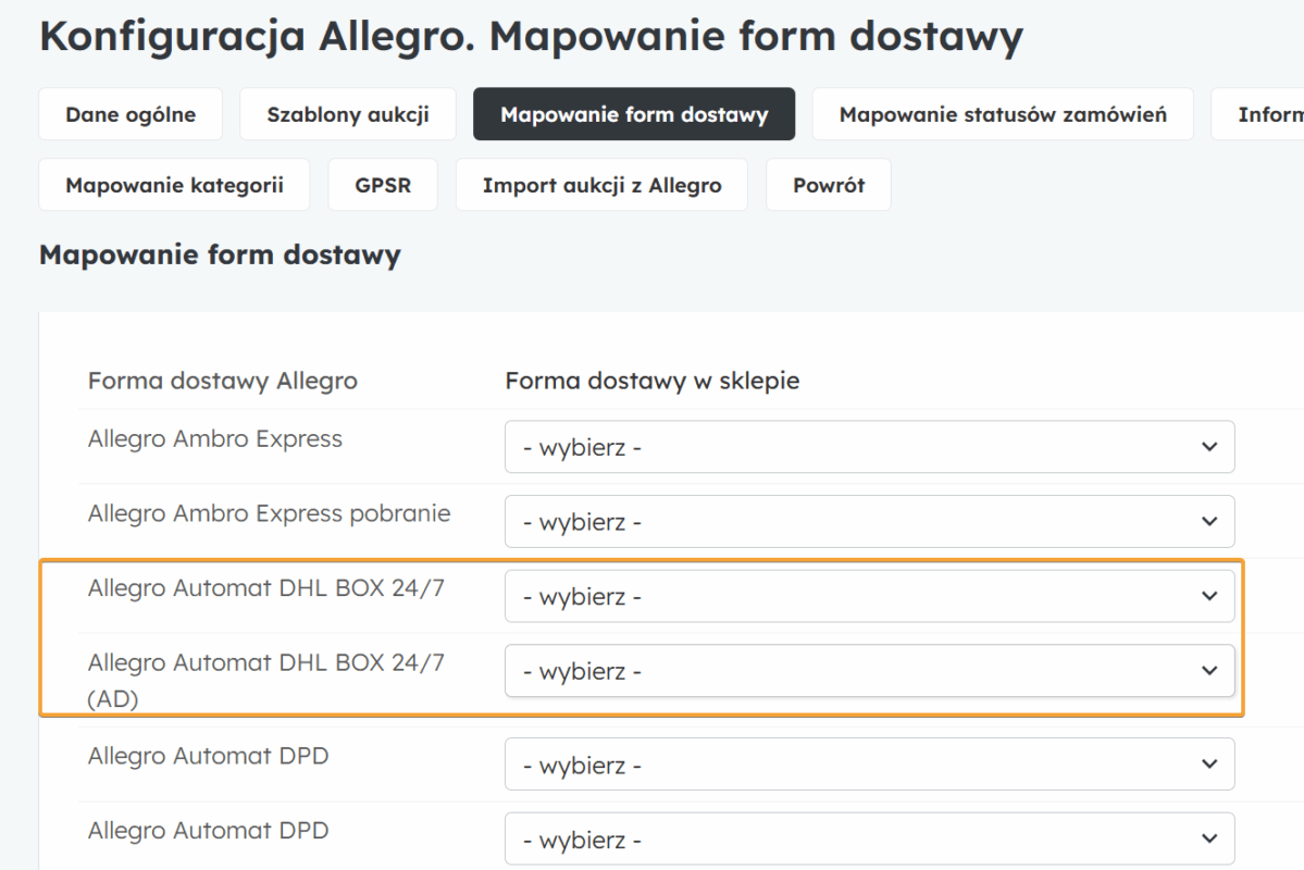 Mapowanie form dostawy Allegro – dodano obsługę nowych metod DHL i DPD (AD)