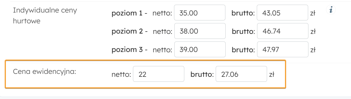 W produktach dodano nowe pole ceny ewidencyjnej, umożliwiające zapisanie wartości brutto (netto wyliczane jest automatycznie na podstawie aktualnej stawki VAT). Cena ewidencyjna to techniczna wartość wykorzystywana w rozliczeniach magazynowych oraz integracjach hurtowych, niewidoczna dla klientów.