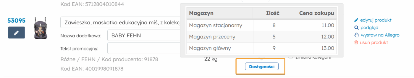 Dodatkowo przy każdym magazynie prezentowana jest cena zakupu netto, co ułatwia szybkie porównanie stanów i kosztów.
