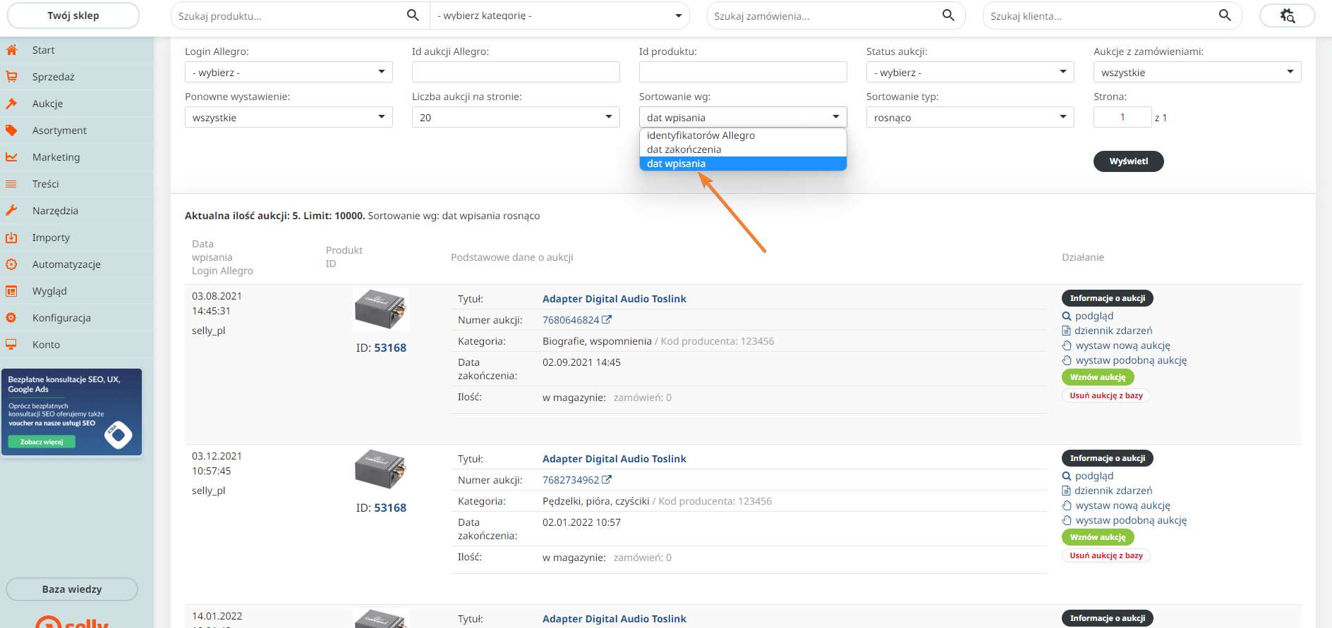 Dodanie sortowania według daty wpisania aukcji na Allegro