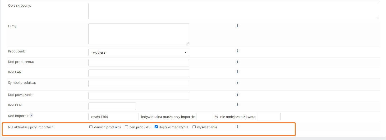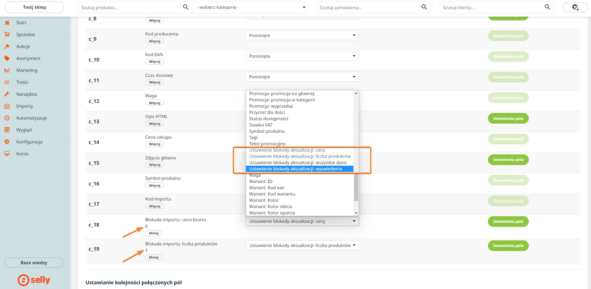 - Ustawienie blokady aktualizacji: wyświetlanie – powiązanie tego pola powoduje włączenie blokady wyświetlania tego produktu w sklepie.